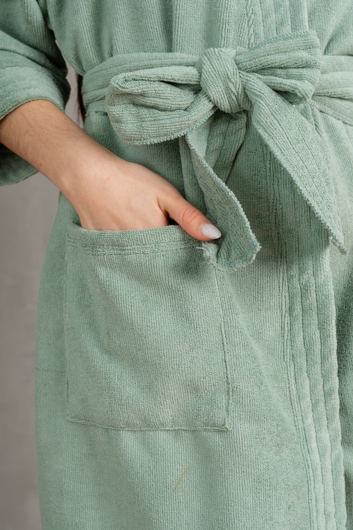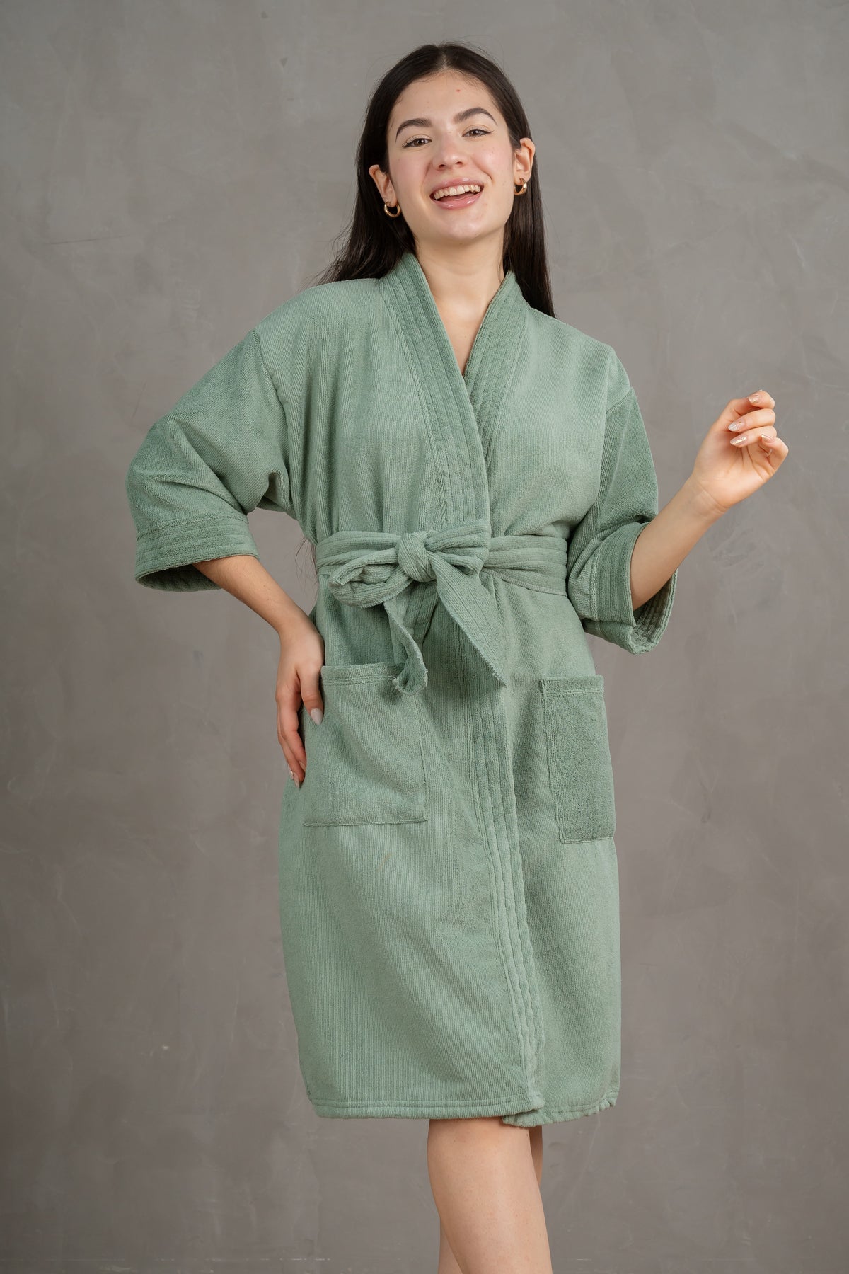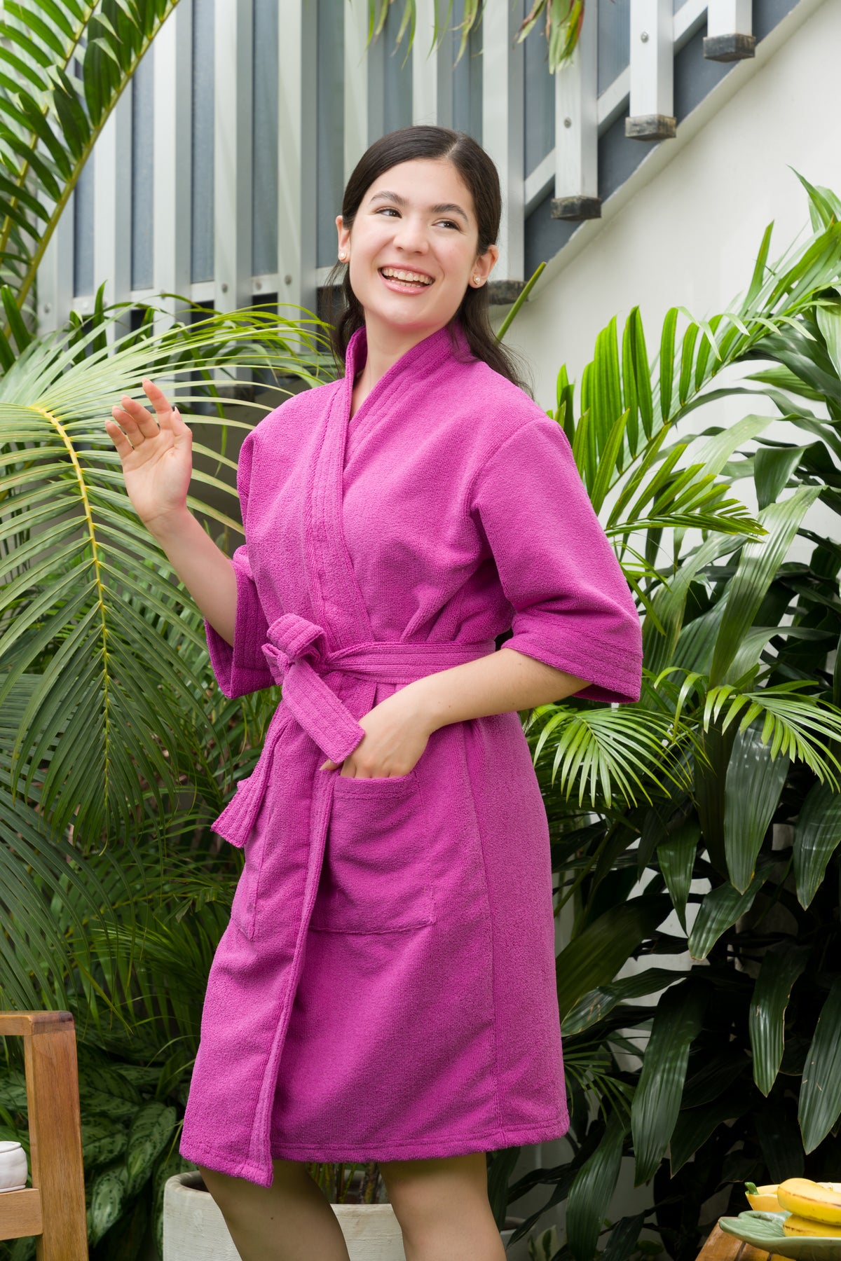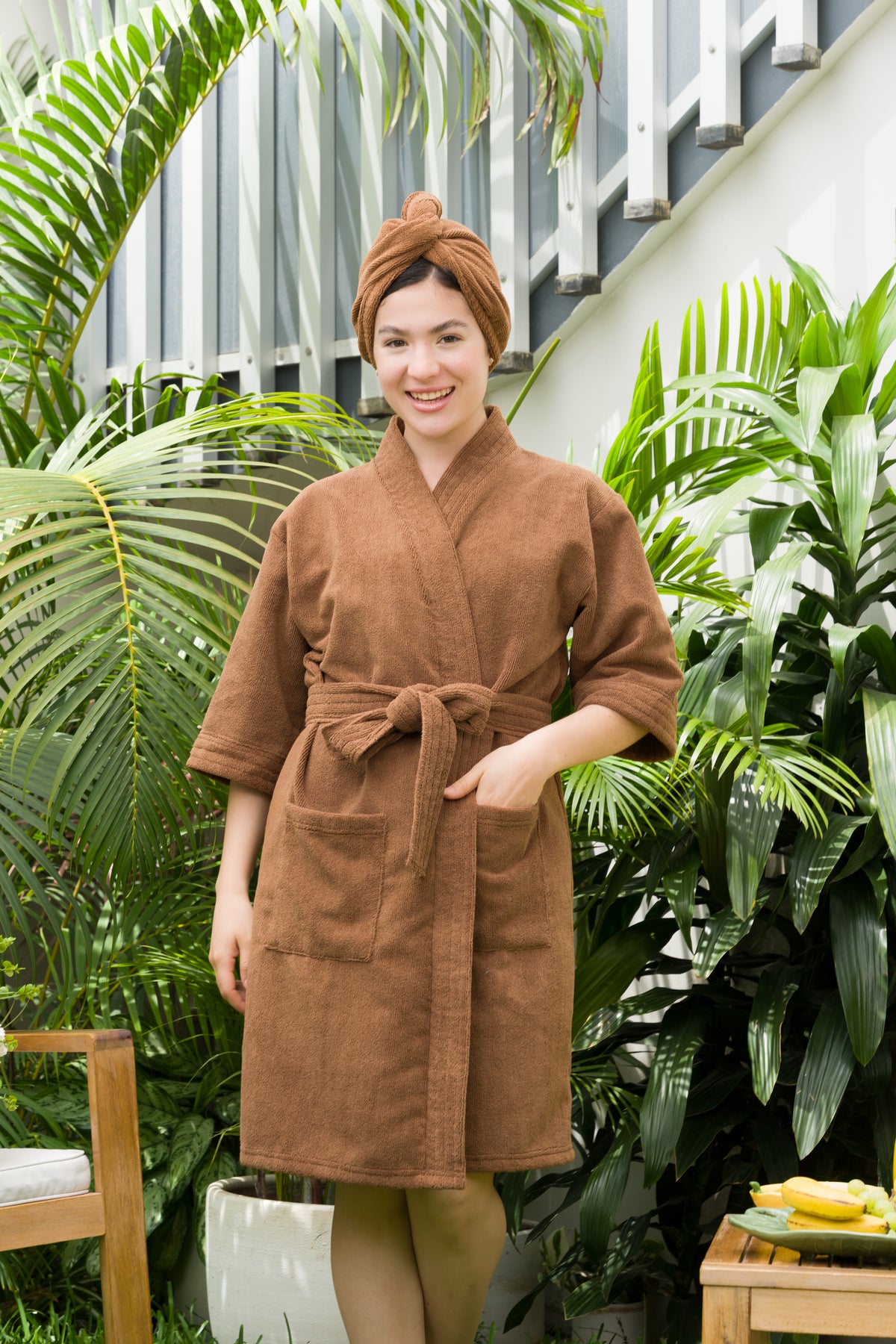 Nuestra bata de baño Lola está hecha en microfibra súper absorbente, suave y resistente que te ayudarán a quitar el exceso de agua y tardar menos tiempo en secarte.